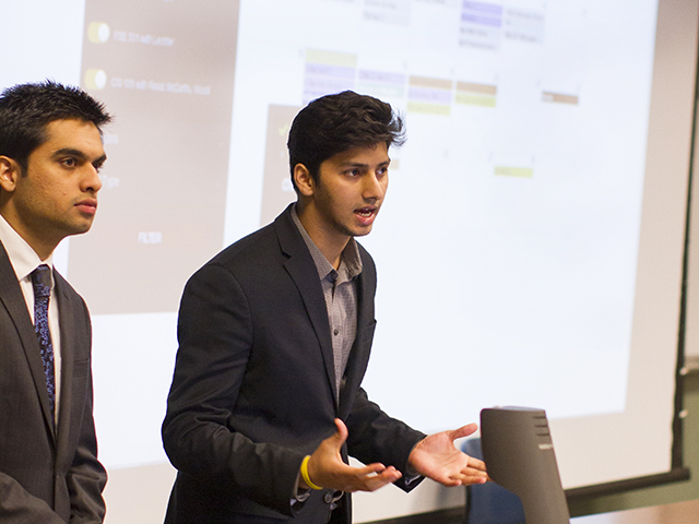 Devils Connect co-founders Devesh Tuteja (left) and Yash Lalwani (right) present their startup to fellow students. Photographer Jessica Hochreiter/ ASU.