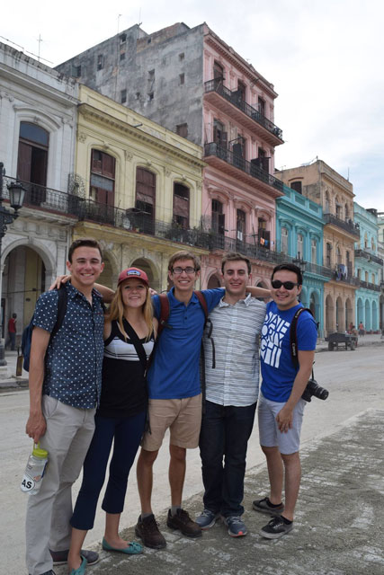 Eric Arellano said, “Contrary to the perception of communist countries as depressing and grey, Havana was lit with bright color.” Pictured from left to right are Jonathon Barkl, Mia Armstrong, Eric Arellano, Grant Laufer, and Brian Garcia. Photographer: Emily Giel