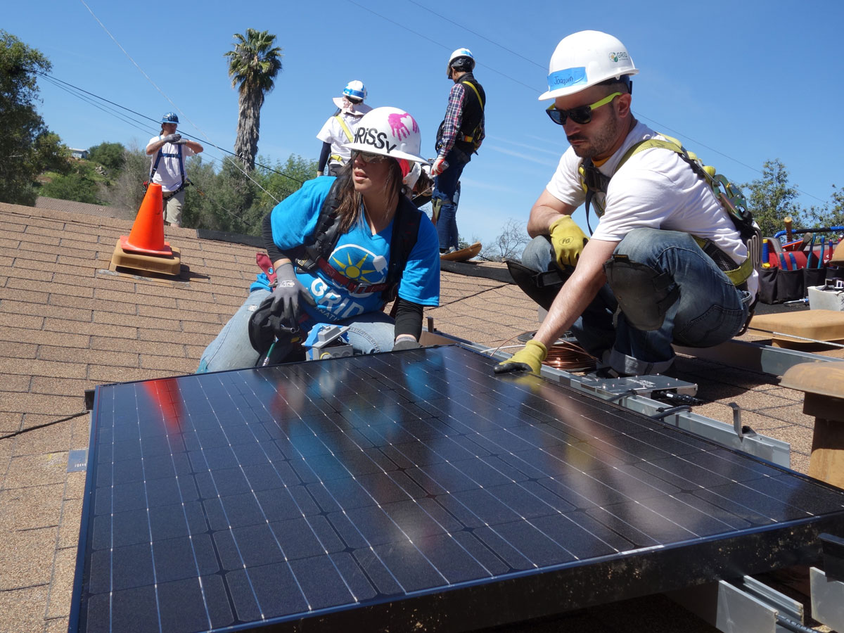 A GRID Alternatives supervisor and Joaquin Santecchia, right, from PSM SEEC check the alignment of the solar energy system. Photo courtesy of Aakash Bhansali.