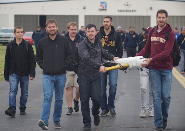 Air Devils team members carry their Manufacturing Support Aircraft to the starting line for one of the Design/Build/Fly competition flight missions. Pictured are (back row, left to right) Ivan Kruts, Nathan Stone, Brendan Hernandez, Walter Bonar; (front row, left to right) Jeffrey Kirkman, AJ Verbin, Ben Anderson.
