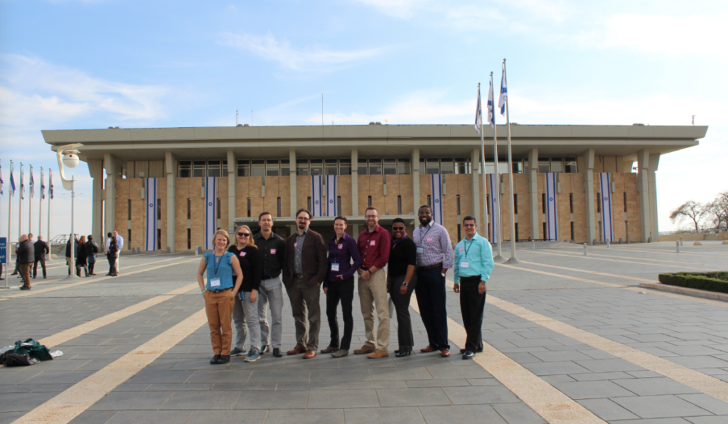 The Arizona State University group – giving the ASU Pitchfork hand sign – stands outside the Ziotowski Student Center at the Ben-Gurion University, one of Israel’s leading research universities. From left to right are ASU student Candace Lewis, Clinical Assistant Professor Karen Guerrero, Associate Professor Adam Carberry, Ben-Gurion University Professor Shai Kaplan, an ASU graduate and now an ASU-BGU partnership project manager, Assistant Professor Francois Perreault, Assistant Professor Abdel Ra’ouf Mayyas, Assistant Professor Jeffrey Wishart, Assistant Professor Blair Braden, Assistant Professor Jeremi London, and Ingram London. Photograph courtesy of Jeremi London/ASUThe ASU group poses outside the entrance to the Israeli Parliament building, called the Knesset, in Jerusalem. Photograph courtesy of Jeremi London/ASU